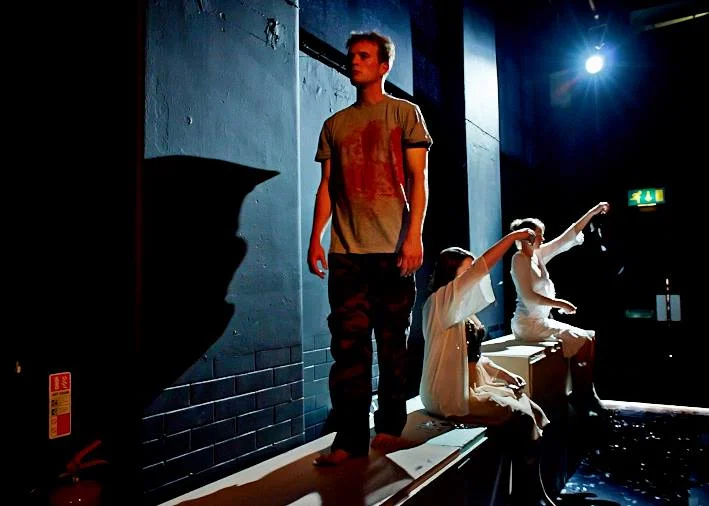 Emily as part of the onstage choir in August012's Roberto Zucco (2014, Chapter Arts Centre). Pictured with Adam Redmore (Zucco). Photography by JORGE LIZALDE.
