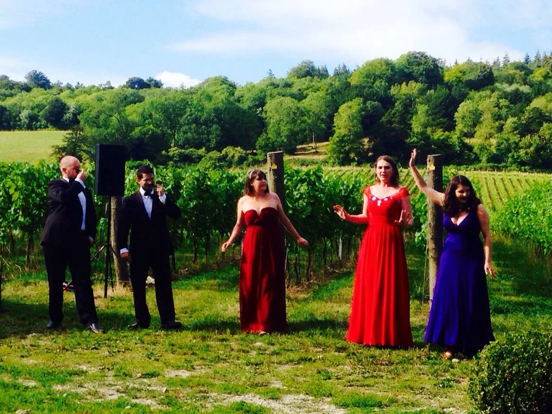 Emily performing in scenes from Cosi fan tutte at Albury Vineyard, alongside (left to right) Adam Jondelius (baritone), Gareth Edmunds (tenor), Frances Gregory (soprano) and Sophie Levi (soprano).